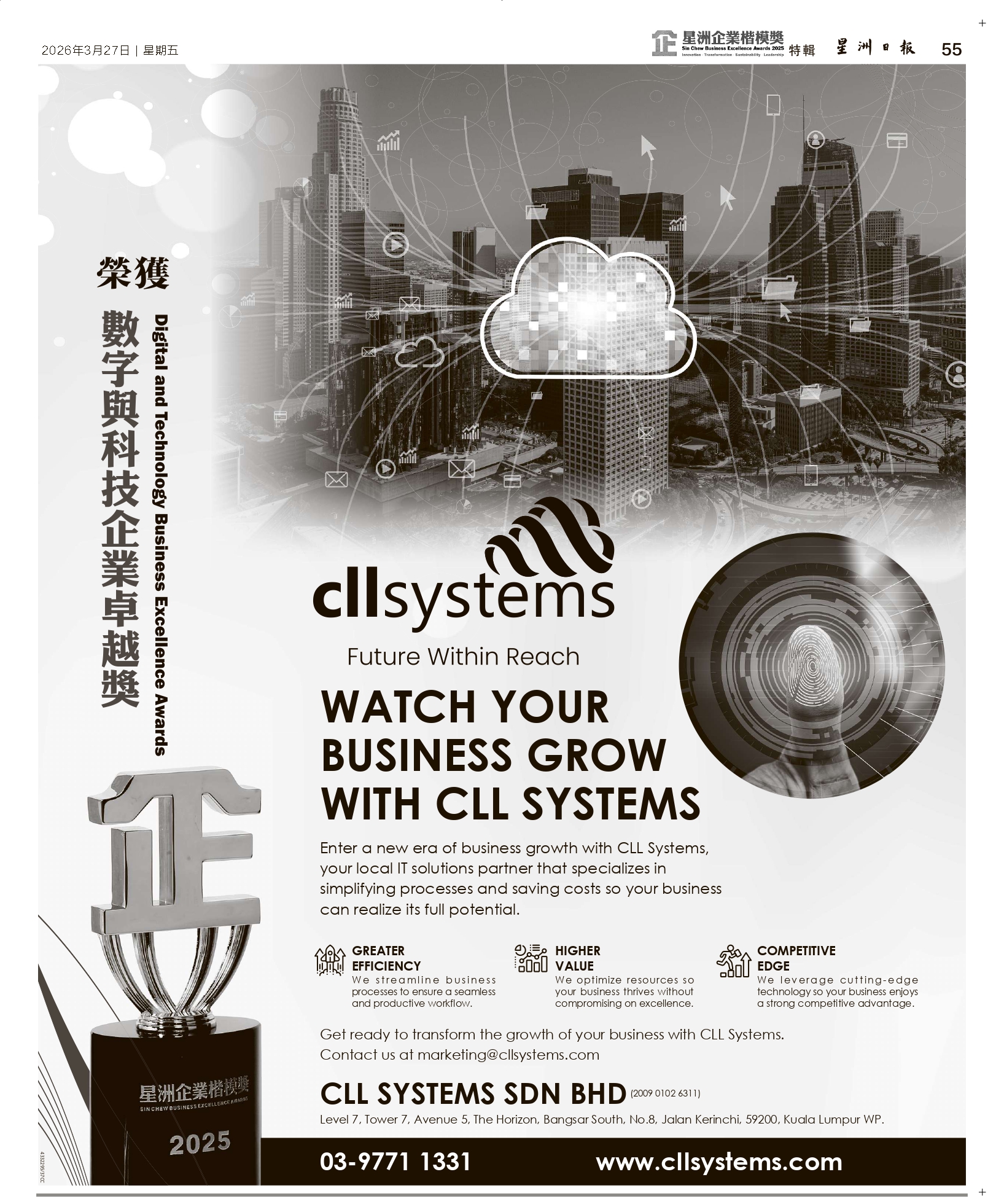CLL Systems has been honored with the Digital & Technology Business Excellence Award 2025 at the Sin Chew Business Excellence Awards, held on 27 March 2026 at Sunway Resort Hotel.